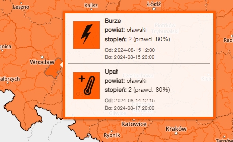 IMGW ogłosiło m.in. dla powiatu oławskiego podwójny alert drugiego stopnia. Dotyczy upałów do 31 stopni Celsjusza (te możliwe są do soboty) oraz burz. Alert burzowy obowiązuje w czwartek od godz. 12 do 23. – Prognozowane są burze, którym miejscami będą towarzyszyć bardzo silne opady deszczu od 35 mm do 45 mm, lokalnie do 55 mm, oraz porywy wiatru do 80 km/h, punktowo do 90 km/h. Miejscami grad – czytamy w komunikacie. Prawdopodobieństwo wystąpienia tych zjawisk synoptycy ocenili na 80 procent.